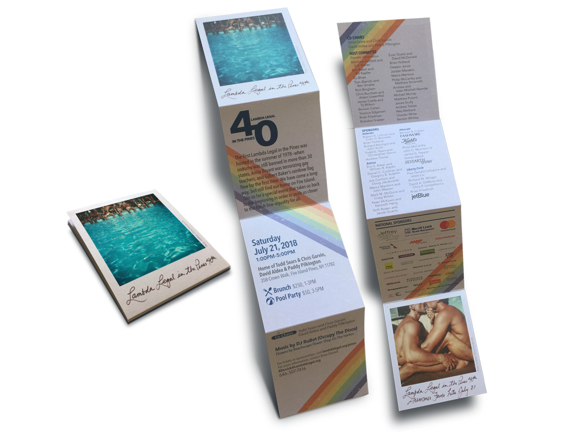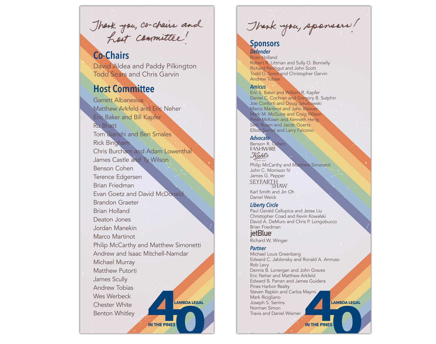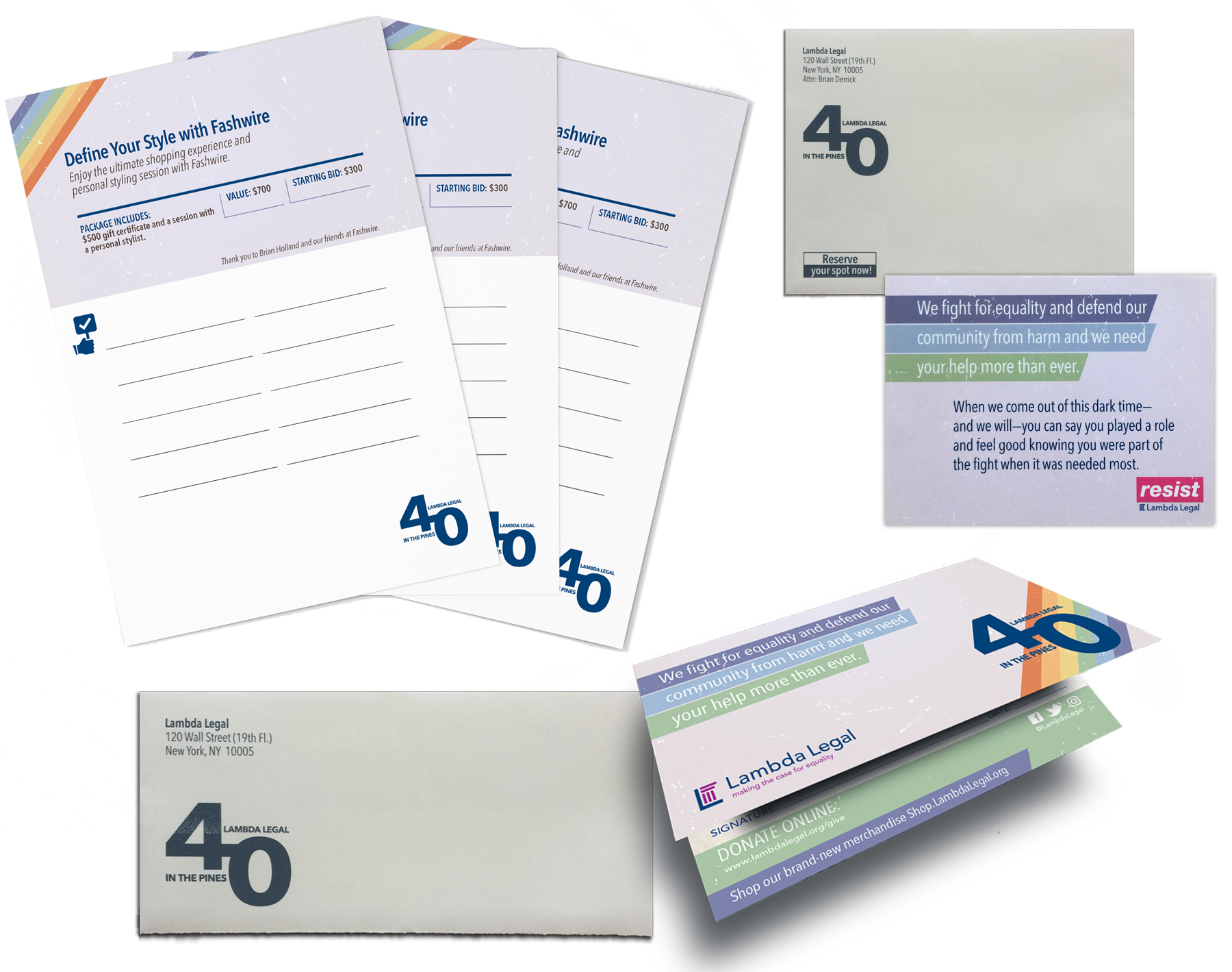 Designed a suite of event materials for Lambda Legal’s milestone year, including invitations, pledge cards, auction sheets, signage, and apparel.