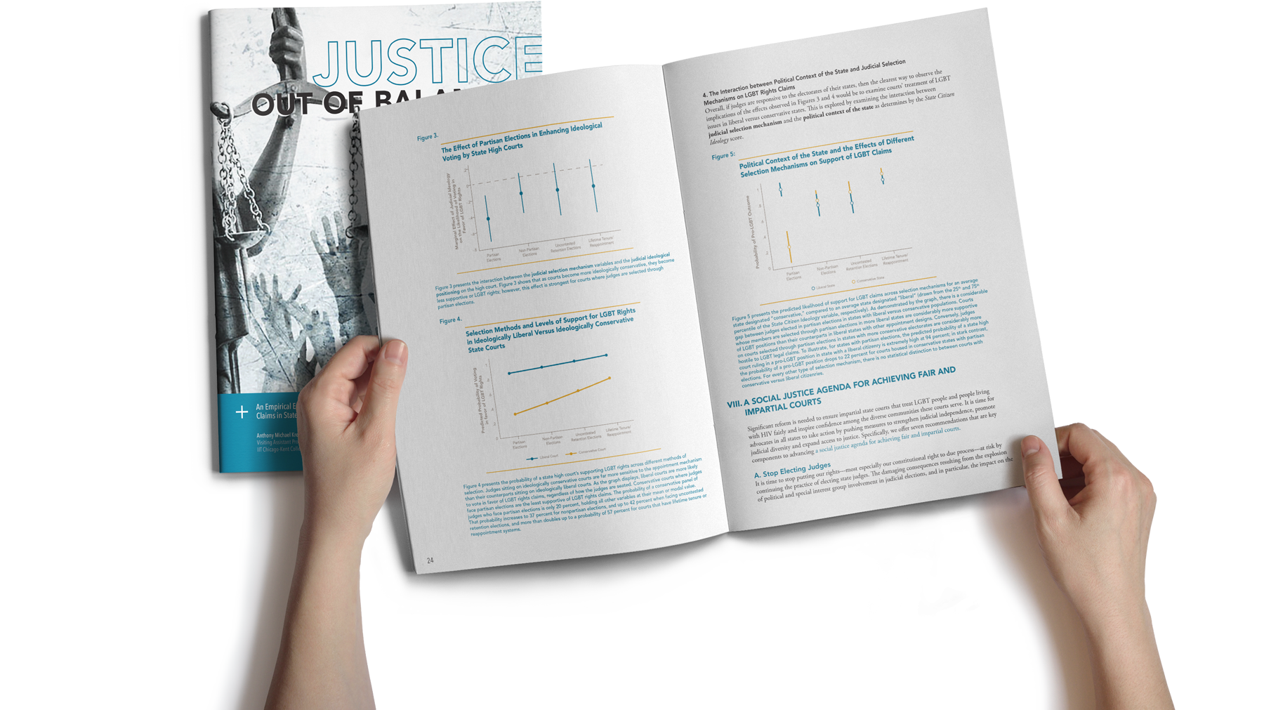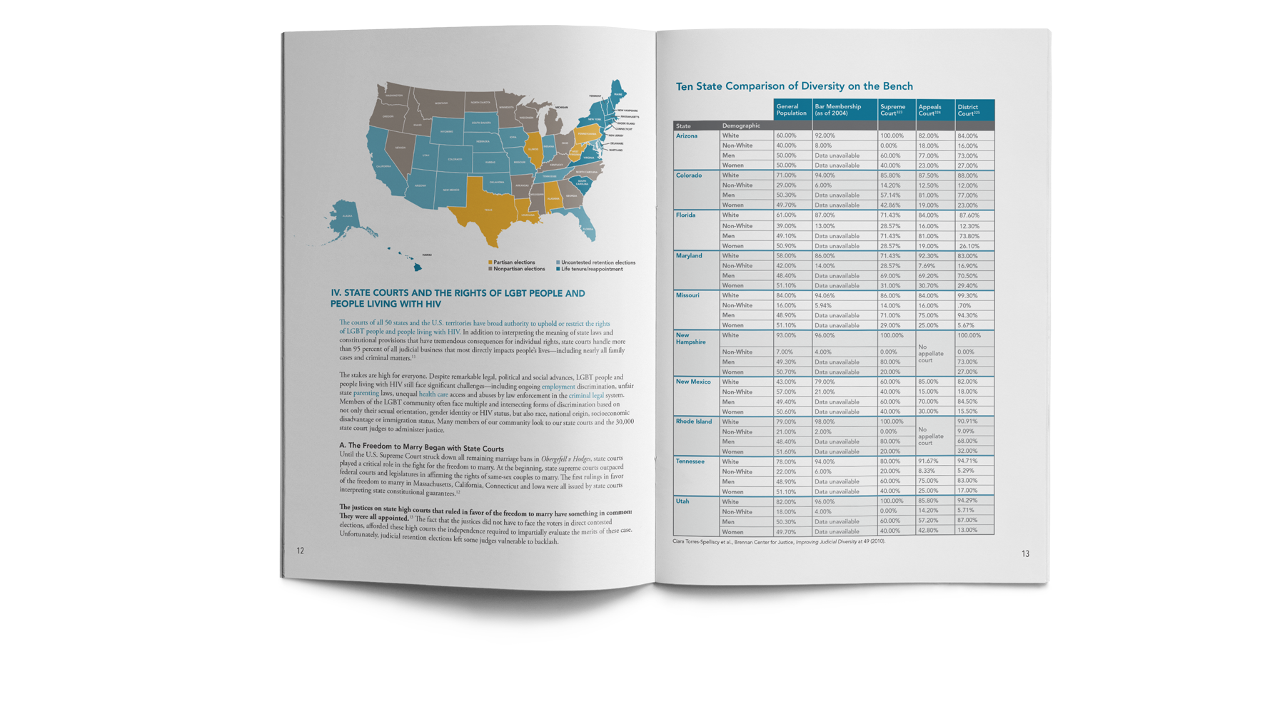 Designed a 32-page report, Justice Out of Balance, examining how the lack of diversity among state elected judges endangers the rights of LGBTQ people. I developed the visual direction, including image sourcing, layout templates, style sheets, data charts, pagination, and footnotes, and managed all pre-press production to ensure a cohesive, professional publication that amplified the report’s findings and advocacy impact.