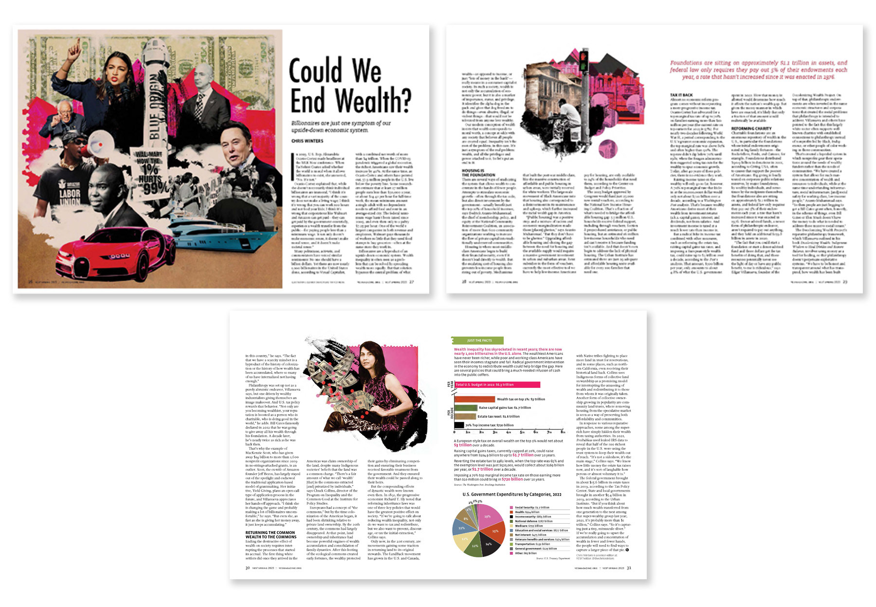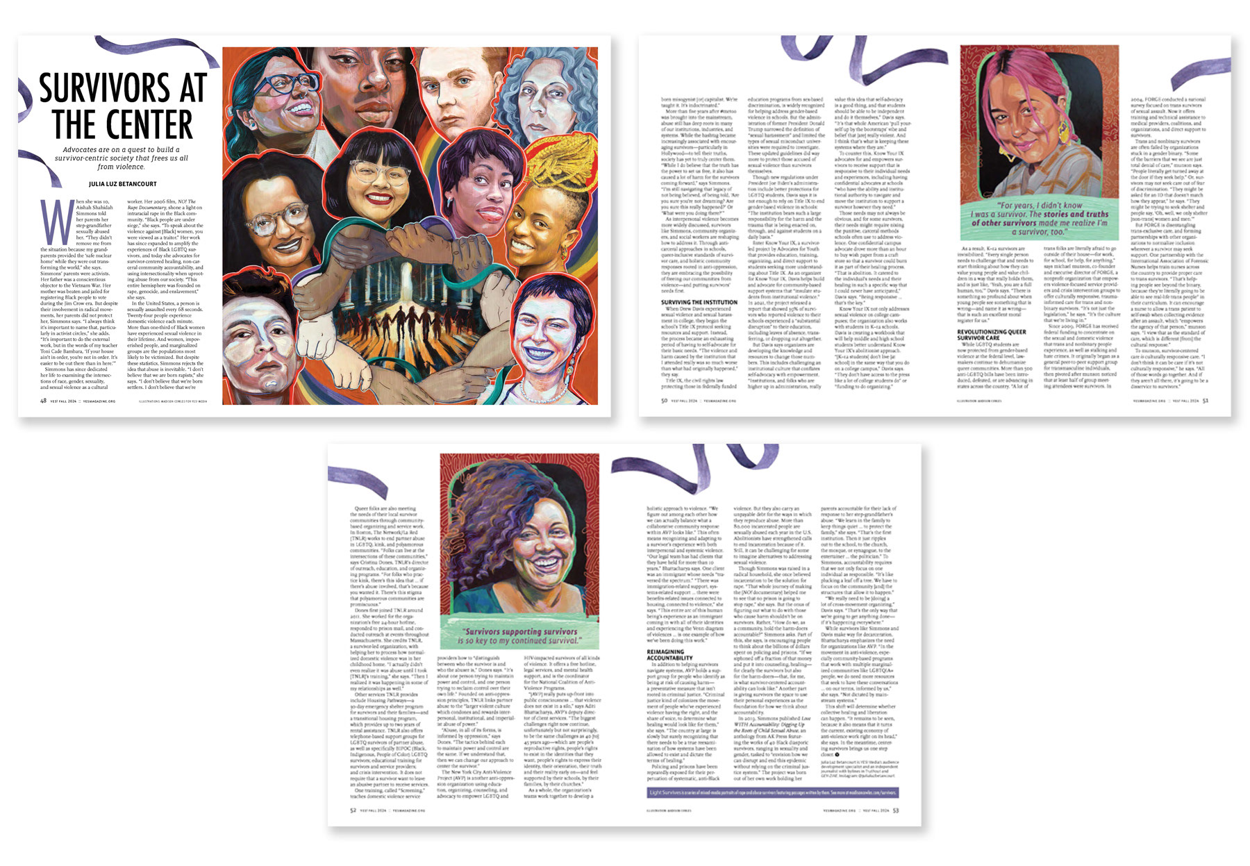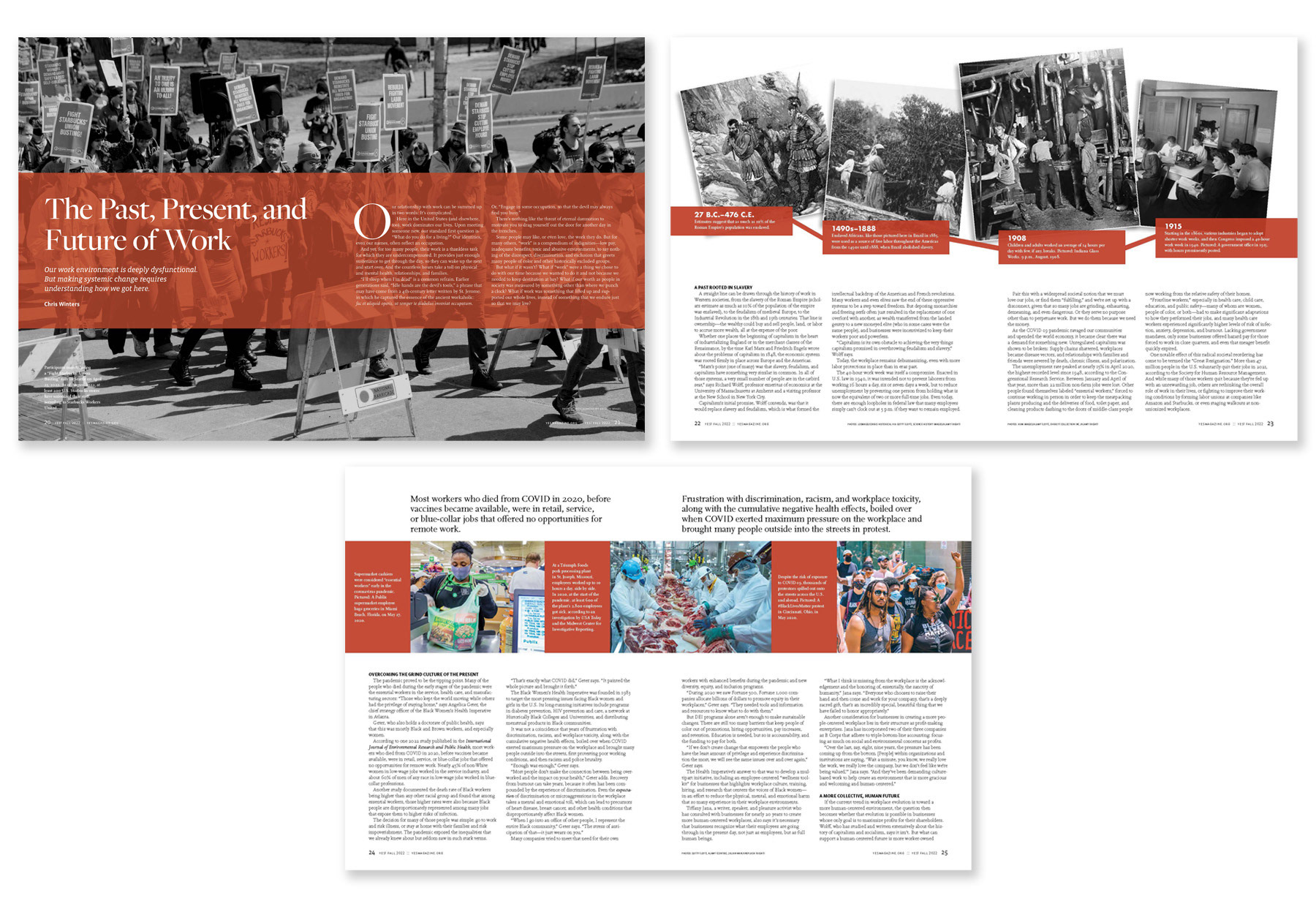 Designed feature spreads by selecting imagery, defining visual style, highlighting key quotes, and translating data into clear graphics.